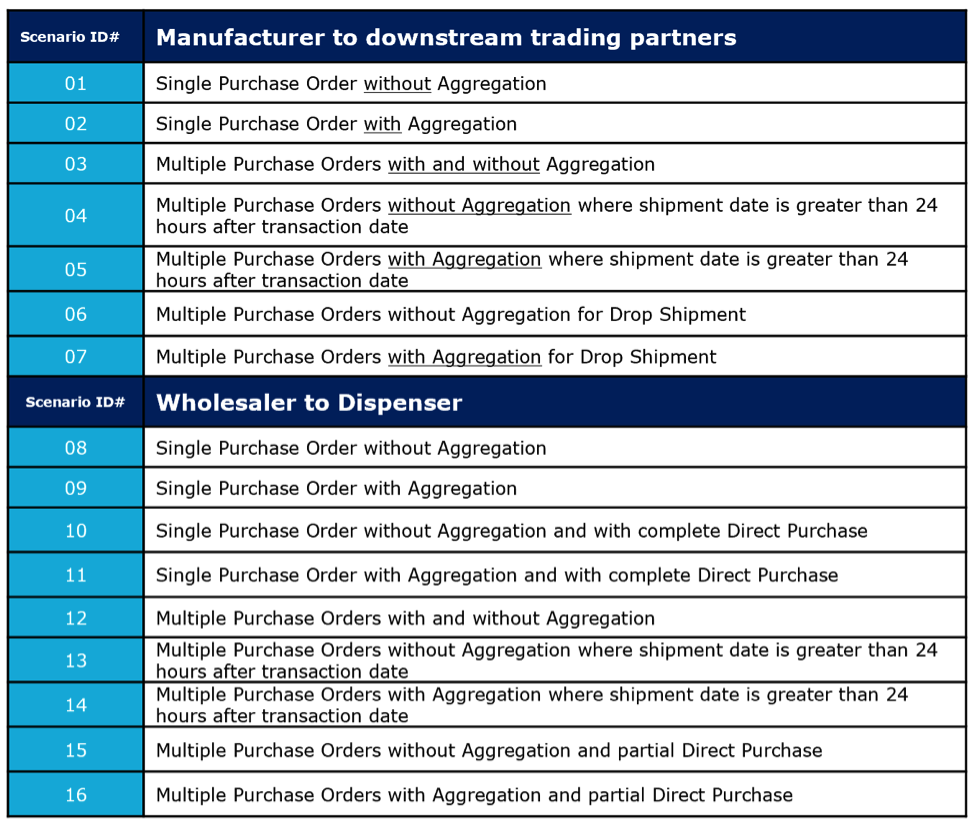 There are 16 GS1 Pharmaceutical Traceability Scenarios covering both manufacturer and wholesaler scenarios. Submitted EPCIS messages that fully conform to the requirements, as evidenced by their ability to generate conforming EPCIS messages for each scenario, are issued a Gateway Certificate.